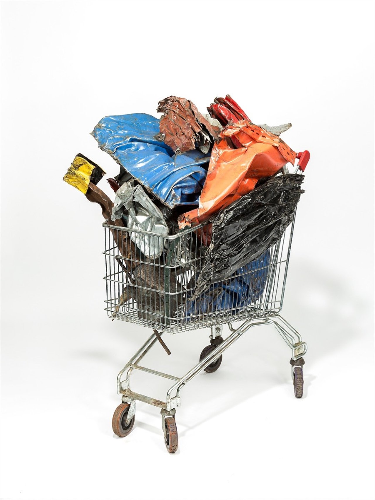 Ohne Titel, aus der Serie „Wagon (Car-lots briumful)“. 2013. Einkaufswagen mit gefundenen Metallobjekten, teilweise verschweißt und farbig gefasst. EUR 4.000–6.000. Verkauft für 8.255 EUR (inkl. Aufgeld)